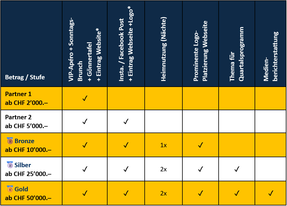 Unsere Spendenstufen zeigen dir, welche Gegenleistungen du je nach Beitrag erhältst – von Einladungen bis zu exklusiver Sichtbarkeit. Jeder Beitrag bringt uns dem neuen Byfangheim einen Schritt näher. Gerne kannst du dich bei unserer Finanzkommission melden: Mail an die Finanzkommission
